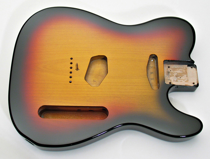 Tele® style three piece alder body. Made in Japan. Vintage specs. and routed for traditional Tele® style single coil pickup configuration. Drilled for metric string ferrules. Comes with a set of appropriate chrome string ferrules at no extra charge. Factory finished in top quality, three tone sunburst gloss poly. Typical weight is around 5 lbs. $450
