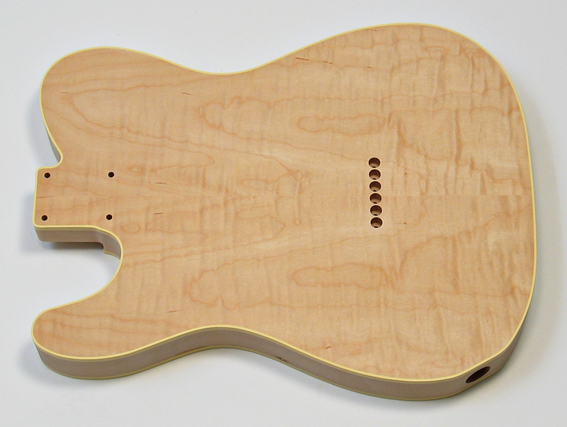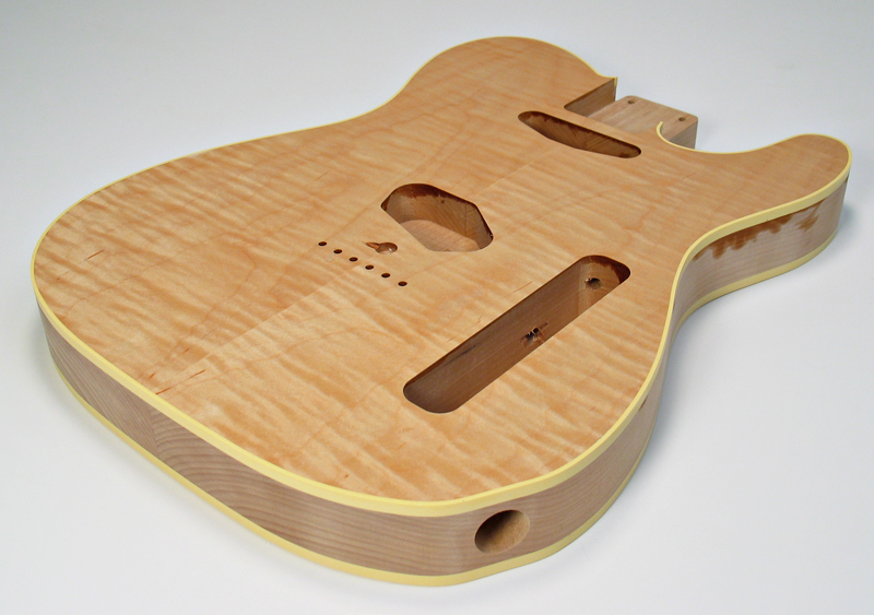 Tele® Custom style two piece American Alder body with curly maple caps top and bottom. Manufactured in Japan. Edges bound in cream single ply binding (2mm. x 6mm.) Vintage specifications and routed for traditional Tele® style single coil pickup configuration. Fine sanded and ready for spraying. Supplied with a set of chrome metric string ferrules at no extra charge. (For bottom picture we gave it a quick wipe over with prepsol to give you an idea of what it would look like with a finish). $425 |
