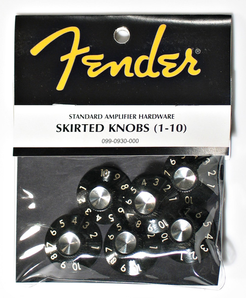 Fender® skirted (1-10) amp knobs. Screw lock. Set of 6. Packaged. For Blackface, Silverface Fender amplifiers and the like.