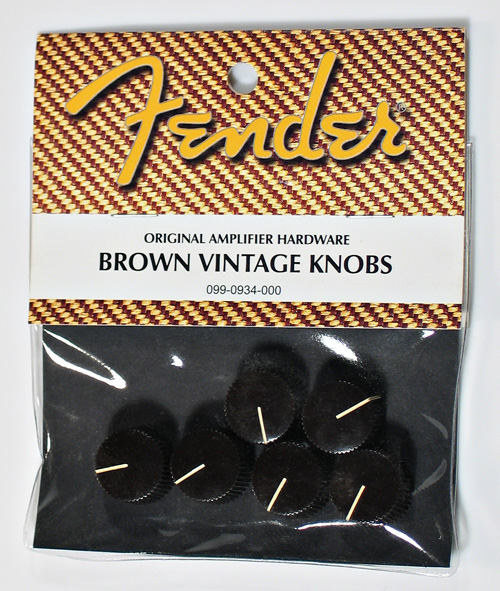 Fender® brown vintage amp knobs. Screw lock. Set of 6. Packaged. For 1960's brown tolex Fender Amps