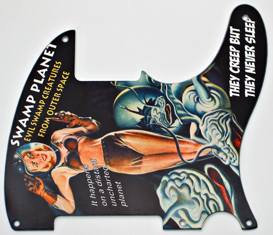 Greasy Groove custom made pickguard for Esquire style guitar with an image of a '50's Sci-Fi Pulp cover "Swamp Planet" impregnated into high gloss plastic. '50's style 5 screw mount. A cool pickguard to dress up and individualize your Esquire.