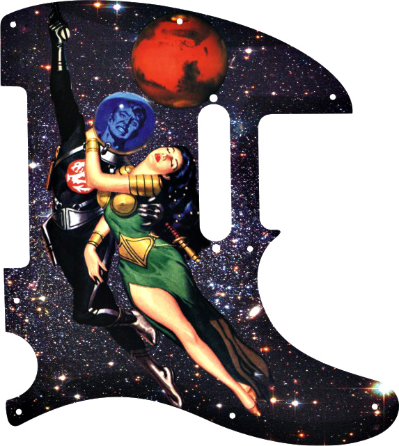 Greasy Groove custom made pickguard for Tele® style guitar with an image of a '50's Sci-Fi Pulp cover "Escape from Mars" impregnated into high gloss plastic. Standard 8 screw mount. A cool pickguard to dress up and individualize your Tele®.
