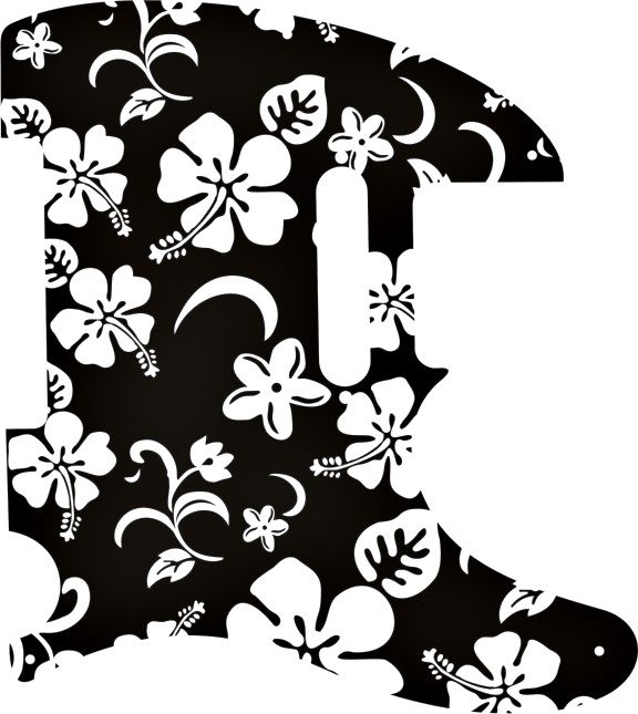 Greasy Groove custom made pickguard for Tele® style guitar with a Hawaiian Print impregnated into high gloss black plastic. Standard 8 screw mount. A cool pickguard to dress up and individualize your Tele®.