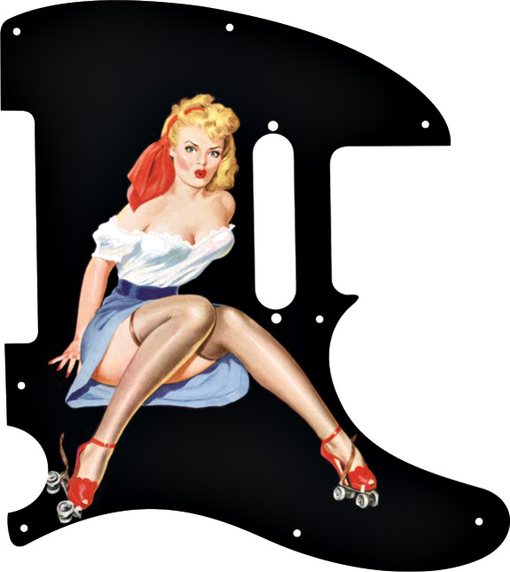 Greasy Groove custom made pickguard for Tele® style guitar with a '50's image of "Pin Up Girl 2" impregnated into high gloss plastic. Standard 8 screw mount. A cool pickguard to dress up and individualize your Tele®.
