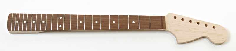 After market vintage Jaguar® style maple neck with slab rosewood fretboard. Made in Japan, top quality and authentic vintage specs. : 7.25" radius, 21 vintage frets, vintage full 'C' profile, the headstock drilled for vintage 'Kluson' style tuners. Fretted and fine sanded ready for finishing. sold out (a couple still available in nitro finish) |