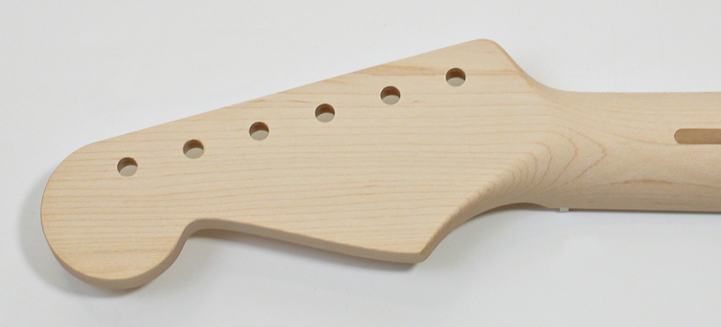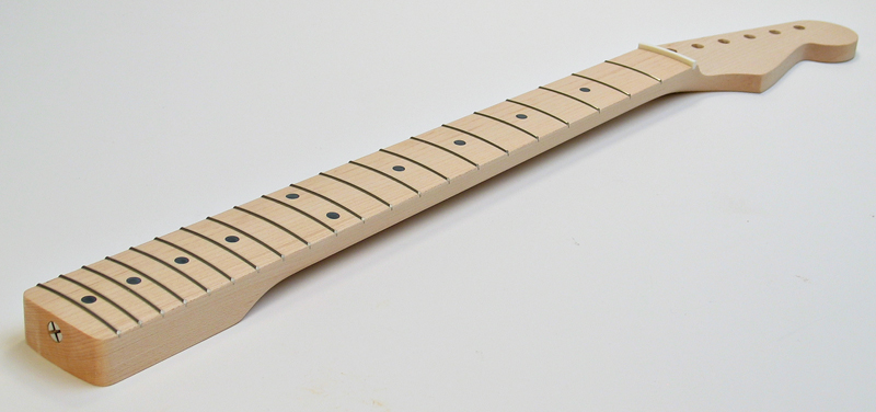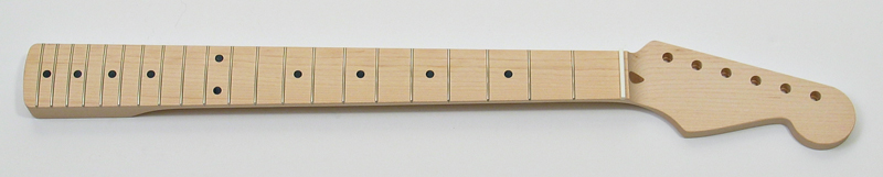 One piece maple neck with skunk stripe for Strat® style guitar. 50's vintage specs. : 21 fret, 7.25" fretboard radius, vintage frets, full 'C' neck profile, Neck width at nut: 42 mm. Width at butt: 56 mm. Headstock drilled for vintage style 'Kluson' tuners. Made in Japan and best quality. Fine sanded, frets dressed and polished, and ready for finishing. $375 |