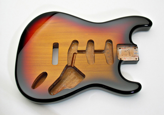 Strat® style three piece alder body. Made in Japan. Vintage specs. and routed for the traditional 3 single coil pickup configuration and tremolo bridge.Factory finished in three tone sunburst gloss poly. Typical weight around 4.5 lbs. $450
