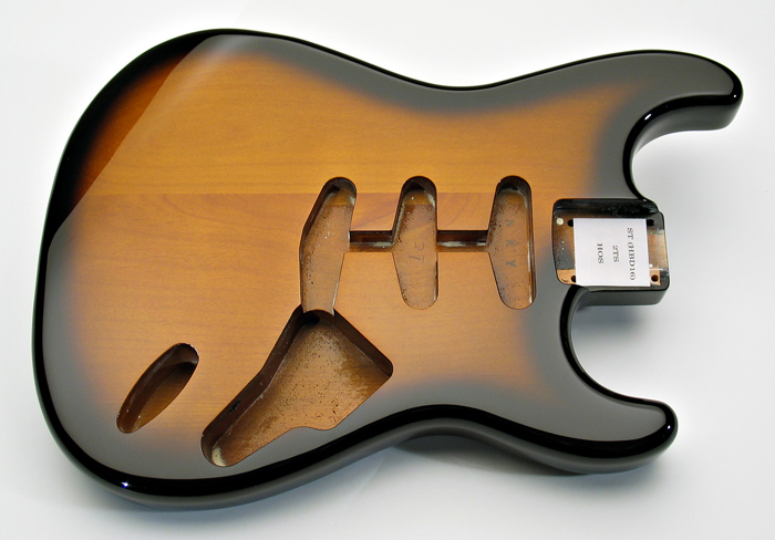 Strat® style three piece alder body. Made in Japan. Vintage specs. and routed for the traditional 3 single coil pickup configuration and a hardtail - non tremolo bridge. Factory finished in two tone sunburst gloss poly. Typical weight around 4.5 lbs. $450 |