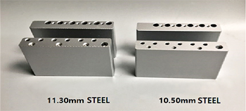 Replacement machined steel Tremolo block for Stratocaster® Two string pitches 11.3 mm (fits standard Fender 11.2-11.3 mm trems. 10.5 mm for the vintage style 6 screw mount Mexican Fender trems. Made in South Korea. Metric thread for the tremolo arm, so these blocks come with matching tremolo arm as well as mounting screws. $60 Replacement machined brass Tremolo block for Stratocaster® 11.3 mm string pitch (fits standard Fender 11.2-11.3 mm trems. Same as the block pictured above but in solid brass. Comes with matching trem arm. $60 |