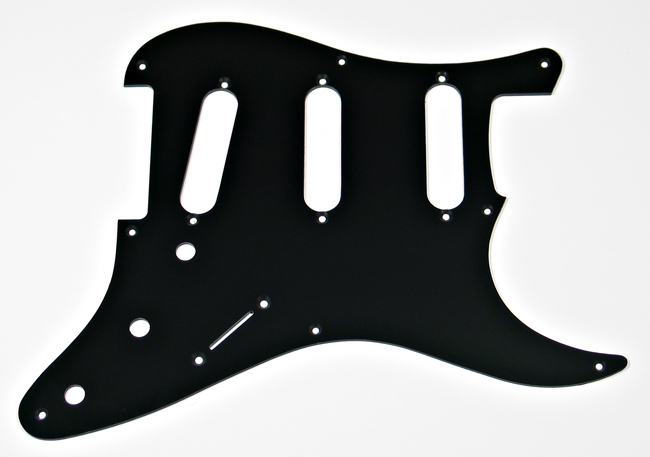 Strat® style pickguard. Single ply black, 1950's style 8 screw mount, gloss finish.