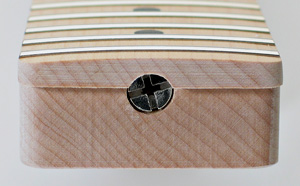 | One piece maple neck with skunk stripe for Tele® style guitar. 22 fret, 12" fretboard radius, medium jumbo frets, vintage full 'C' neck profile, Neck width at nut: 42 mm. Width at butt: 56 mm. Headstock drilled for vintage style 'Kluson' tuners. Made in Japan. Fretted and fine sanded, ready for final shaping of the lower headstock edge and spraying. $375 Pre shaped bone nut blank to suit $5 |