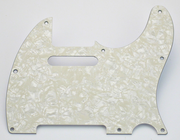 Tele® style pickguard. Yellowish pearloid, three ply (pearl/black/white), gloss finish, 1960's style 8 screw mount.