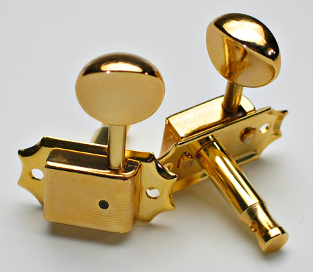 Gotoh SD90 vintage style 3 x 3 tuners with metal oval buttons. Gold finish. Three per side reproductions with original vintage style housings and buttons, but with improved modern 15:1 gearing for smoother more precise action. Set comes complete with bushes and screws.