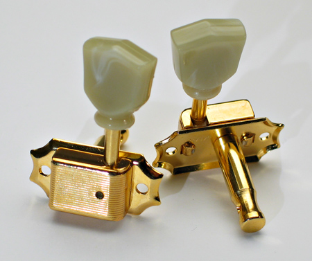 Gotoh SD90 Vintage Tone Revival Tuners with greenish 'Keystone' buttons. Gold finish. Just released by Gotoh. The Vintage Tone Revival set features solid brass posts and bushes. It also has 2 mm. longer posts for extra string winds. Gold finish. Set comes complete with screws in Hosco packaging. $95