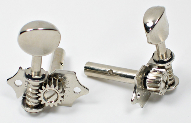 Gotoh SEP700 3 x 3 open backed tuners with nickel oval buttons, 15:1 gearing, for slotted headstocks. Nickel finish. Set comes complete with bushes and screws.